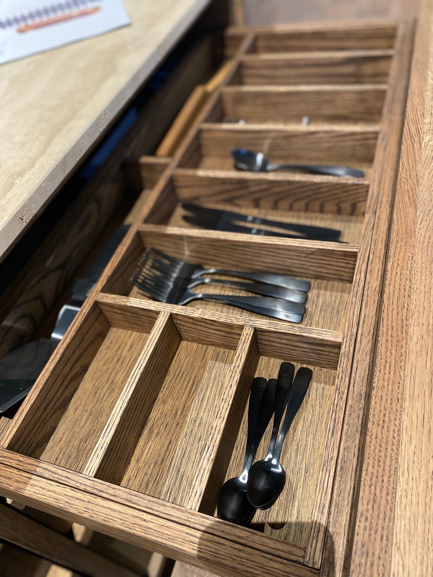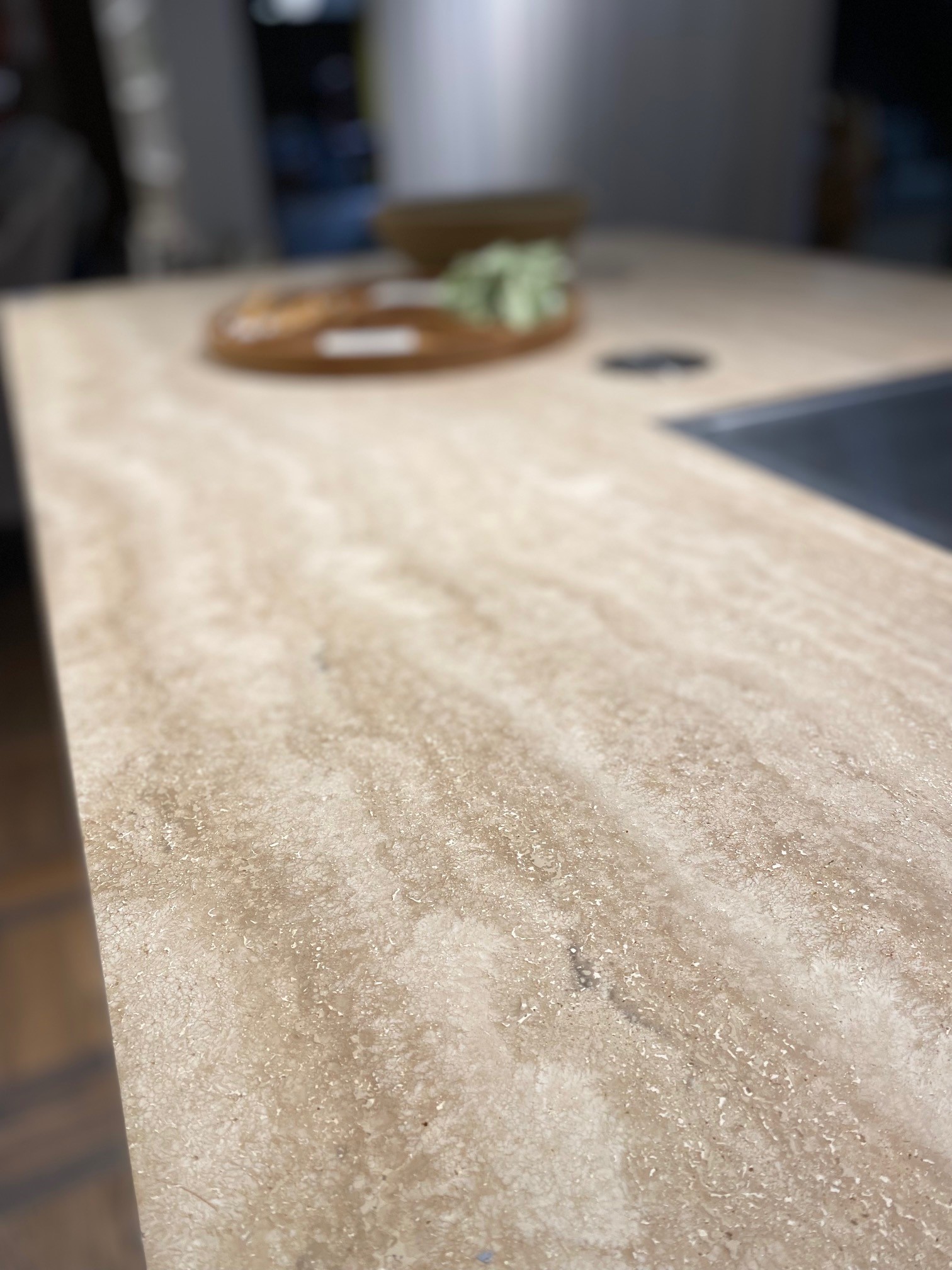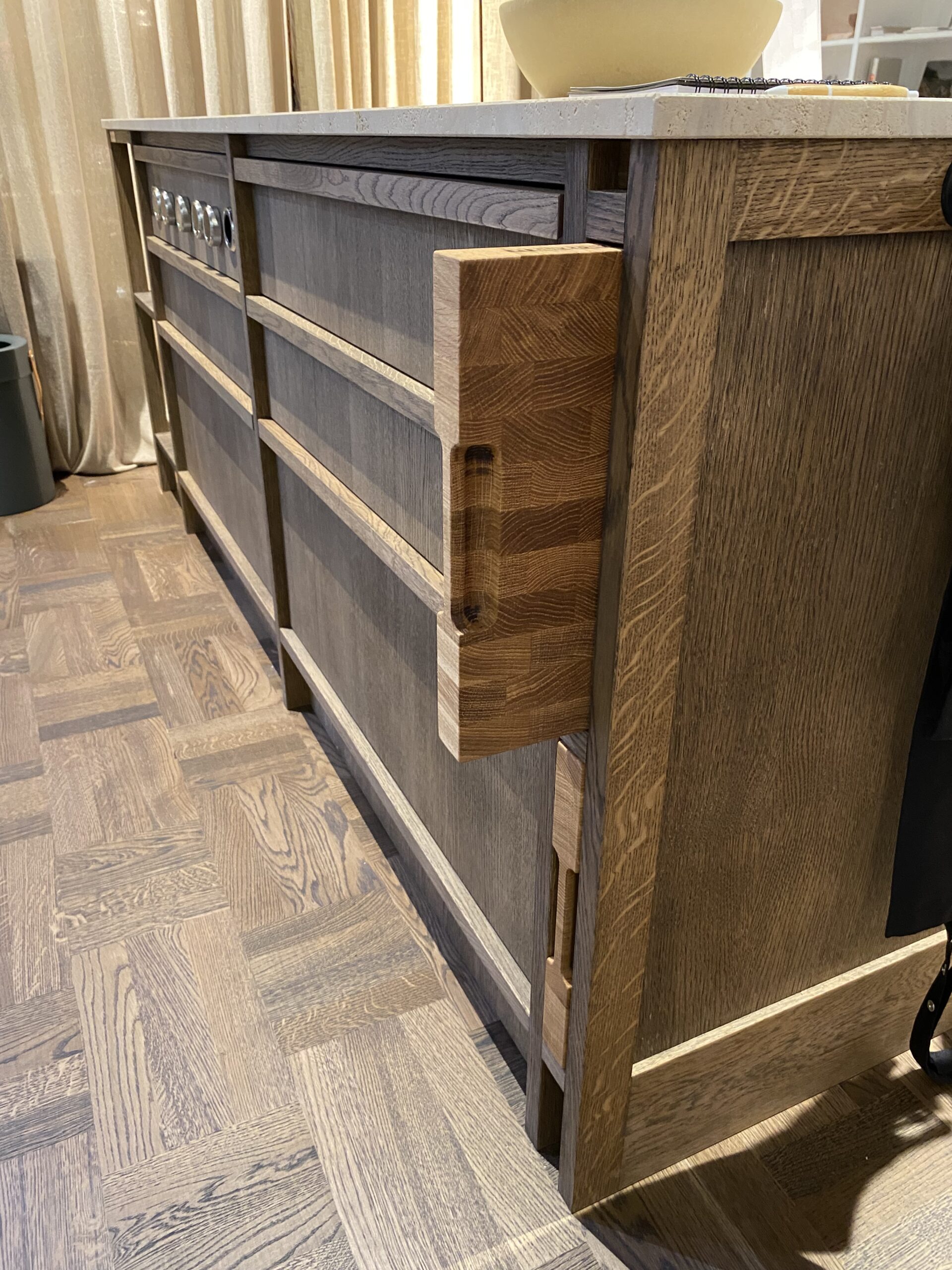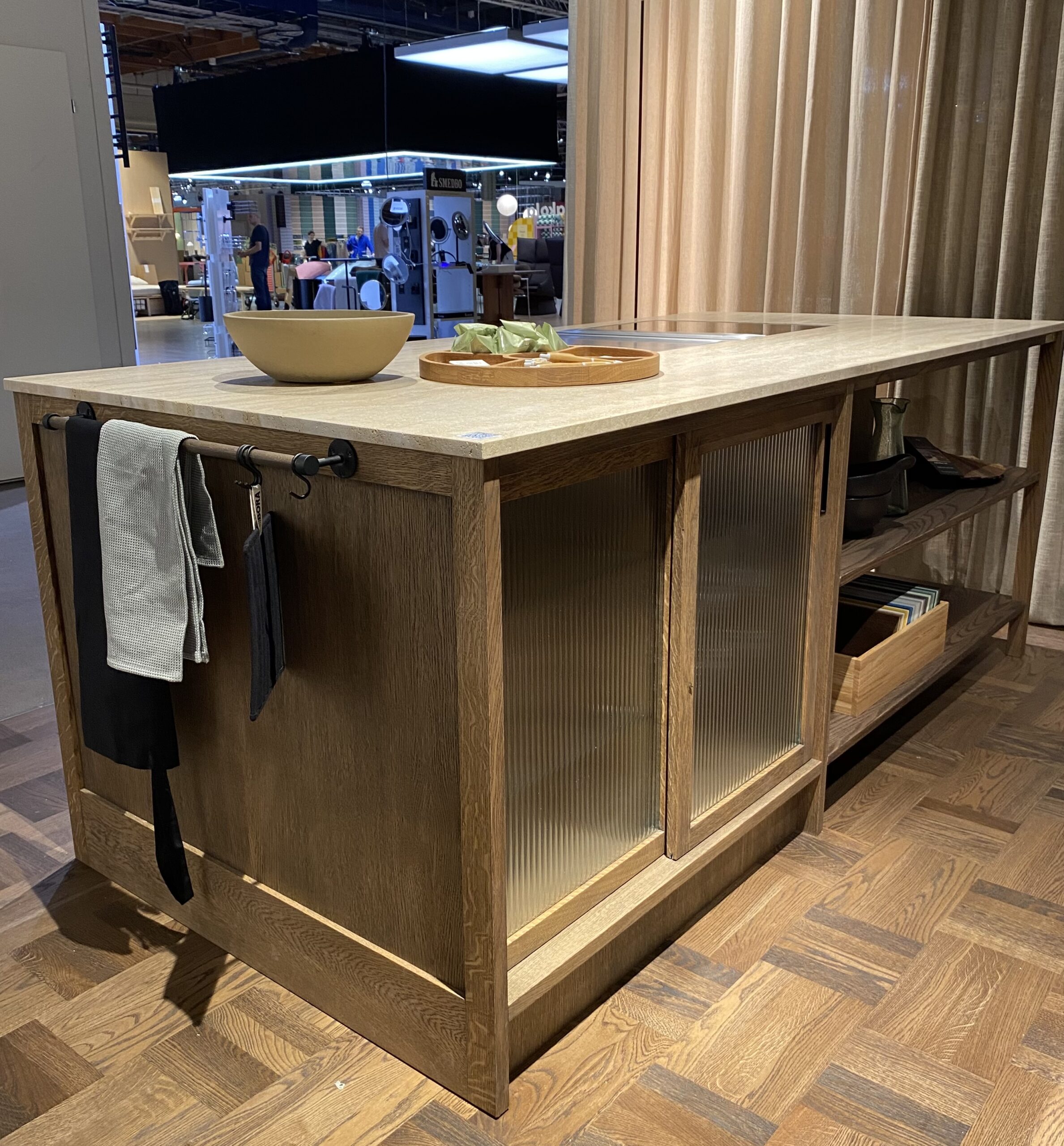 Saareke on osa Jalokalusteen Nykyajan mallistoa. Siinä on tammiviilutettu massiivipuurunko jonka sisään on istutettu sileä tammiviilutettu ovi. Runkosivut menevät lattiaan asti. Myös kaikki laatikot ovat massiivipuiset ja niissä on kauniit liitokset. Yksityiskohtana myös omat lokerot leikkuulaudoille, leikkuulaudat luonnollisesti myös valmistettu Jalokalusteella mittojen mukaan. Saarekkeessa on myös kaunis avohylly-osio. Tason päällä on Travertiini kalkkikivitaso.