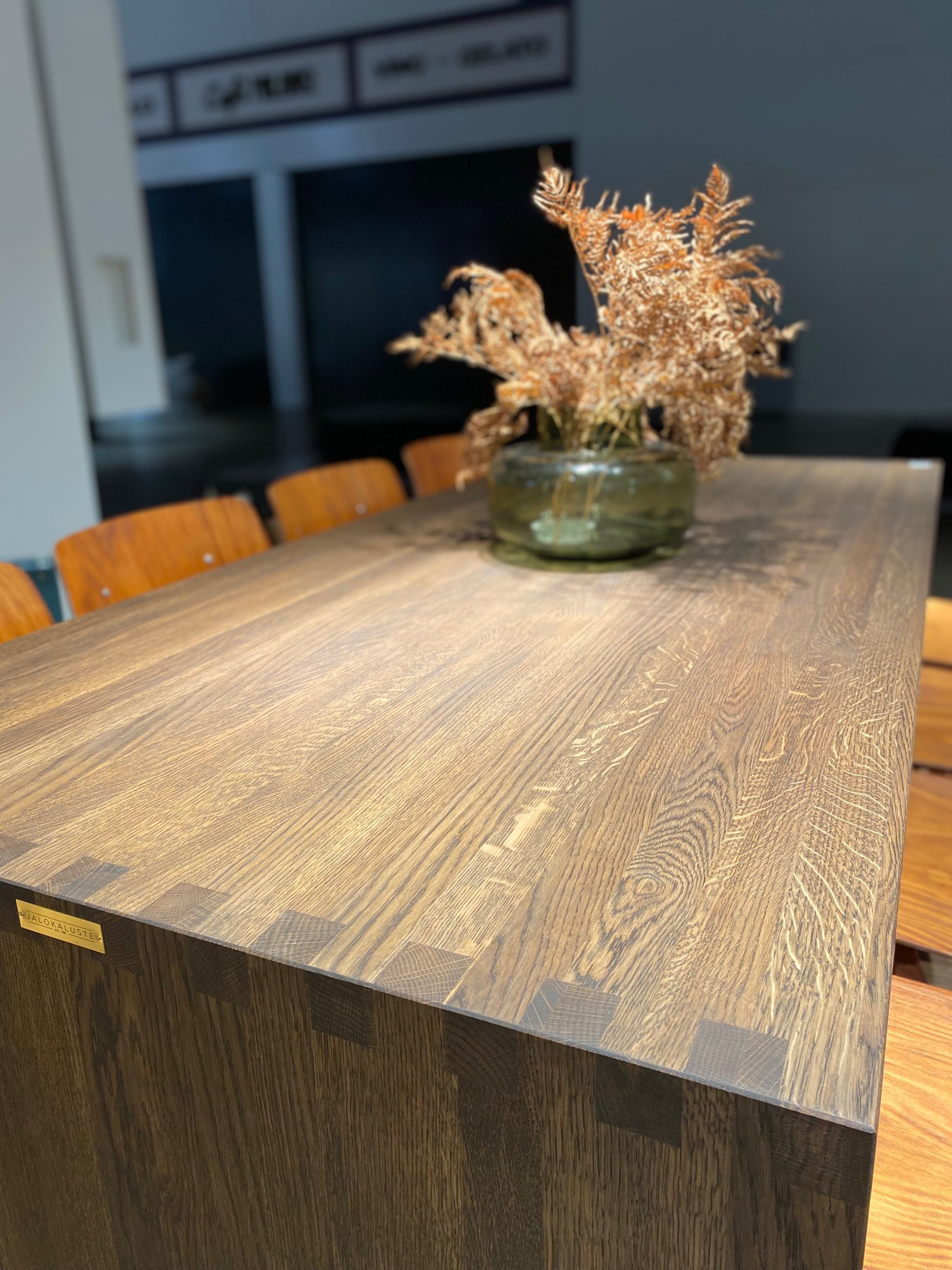 Ruokapöytä on 40mm paksu ja molemmissa päädyissä on erikoisuutena isot sormiliitokset.