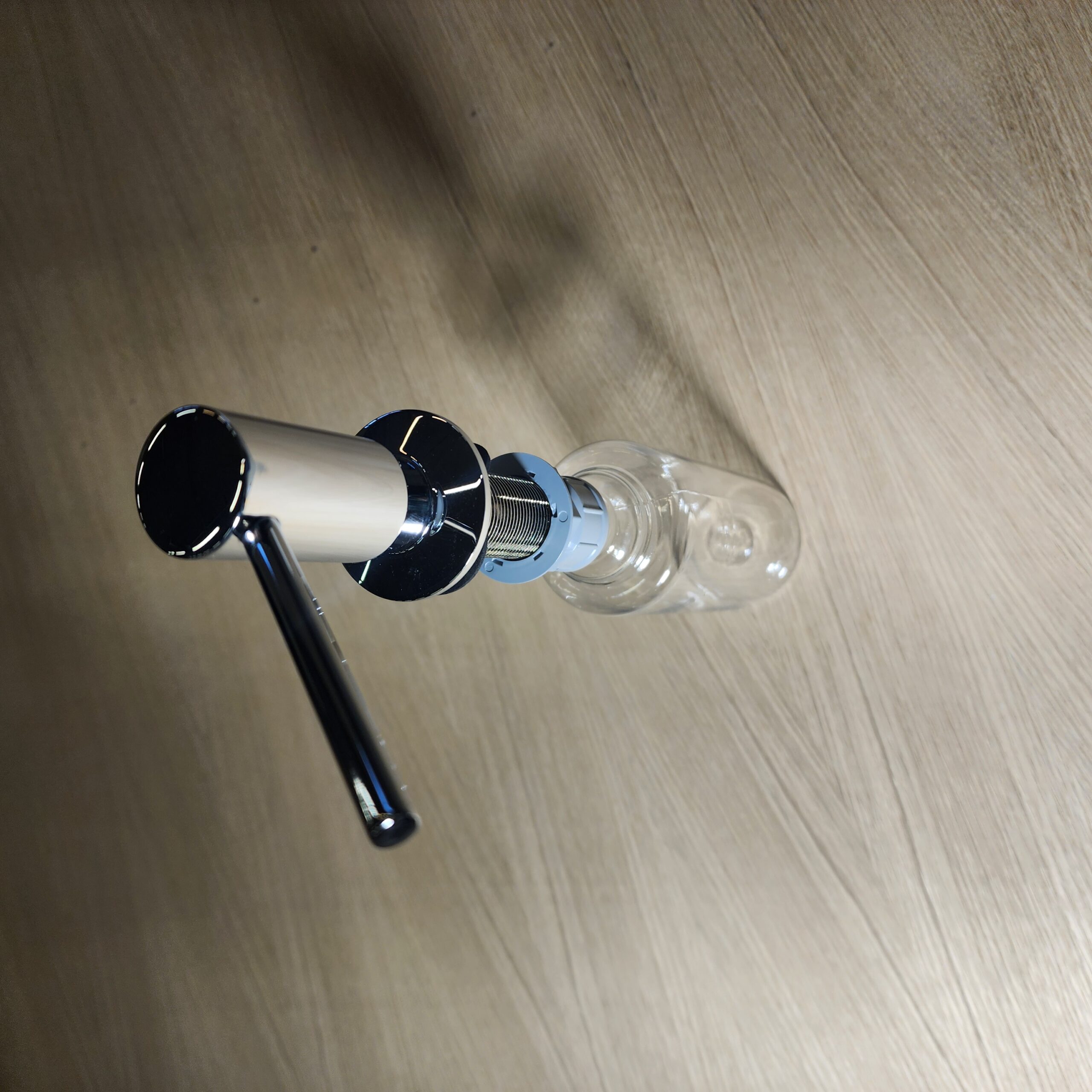 Materiaali/väri: kromi (tason päälle jävät, näkyvät osat) ja kirkas muovi (tason alle jäävä säiliö)