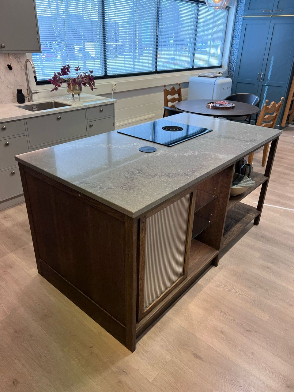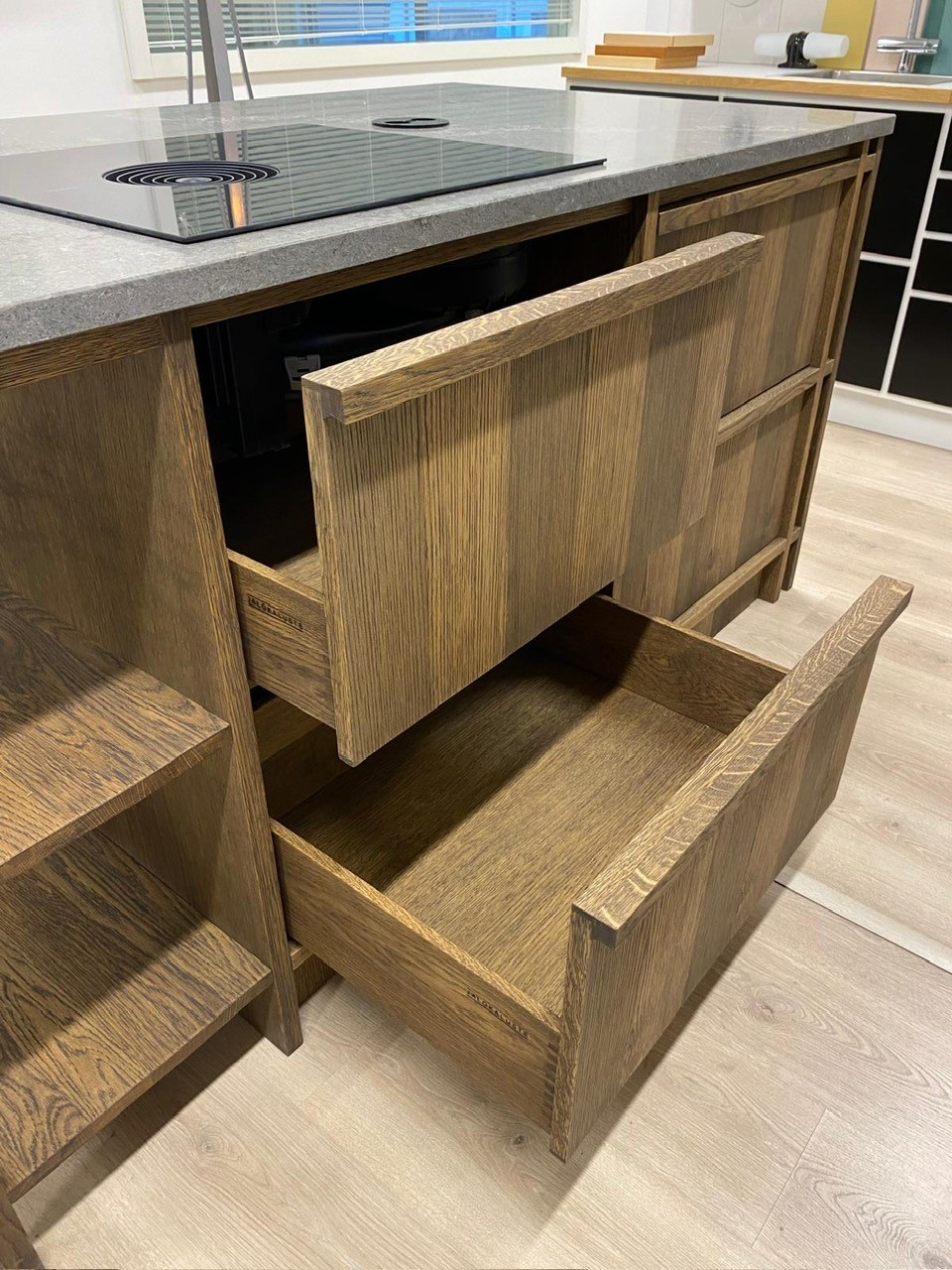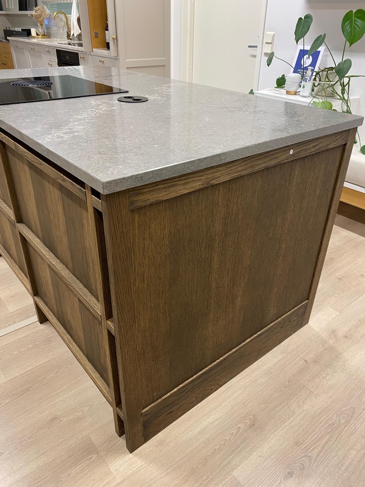Keväällä 2025 valmistunut uusi saareke Nykyajan mallistosta! Saman mallinen kuin Habitare sisustusmessuilla 2025 ollut saareke, noin 40cm kapeampana. Saarekkeessa massiivipuurunko ja tammiviilutetut ovet, laatikot massiivitammipuiset. Mukana myös yksi sokkelilaatikko, aterinlokerikko ja ihana avohylly-osuus.