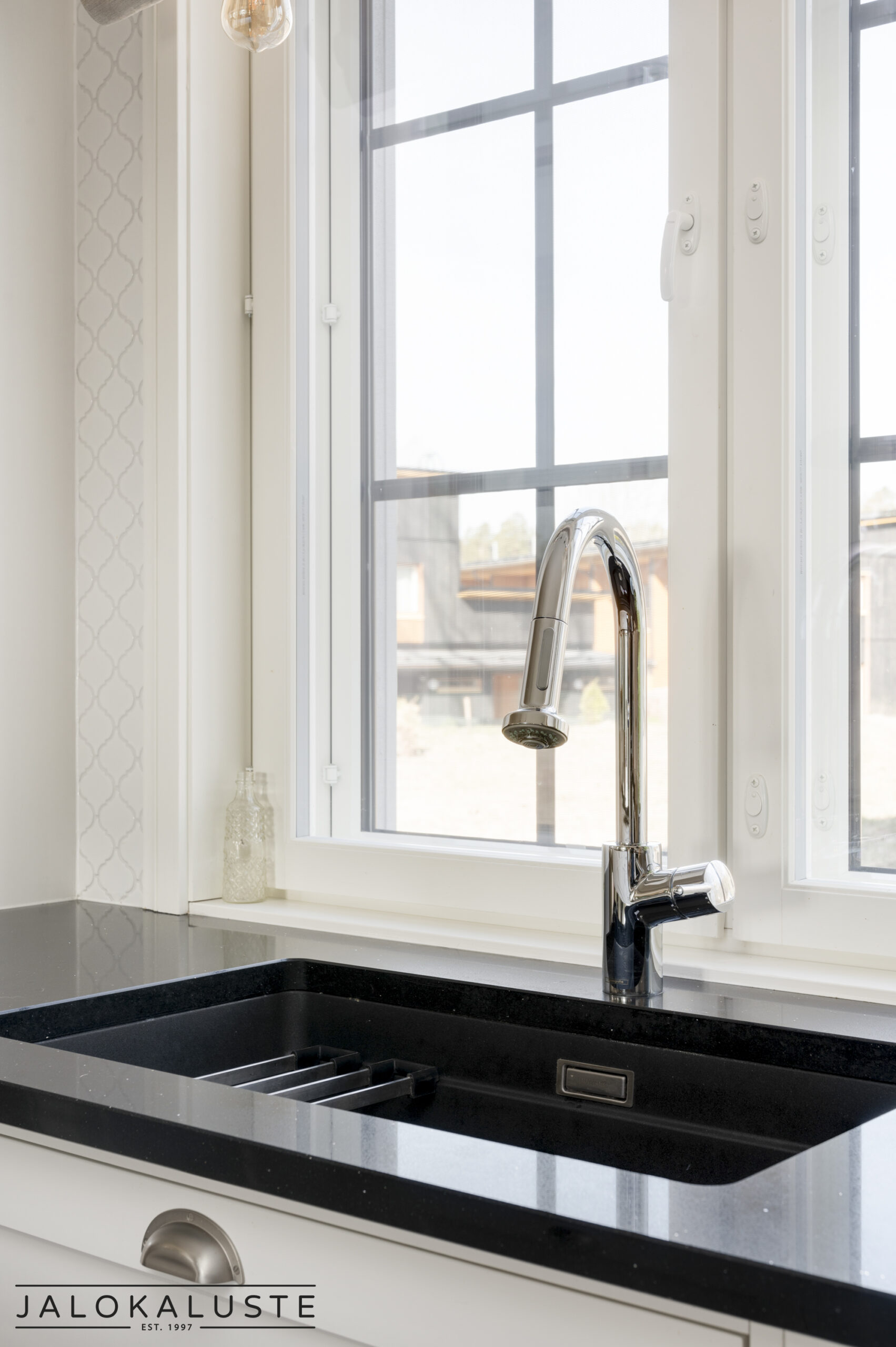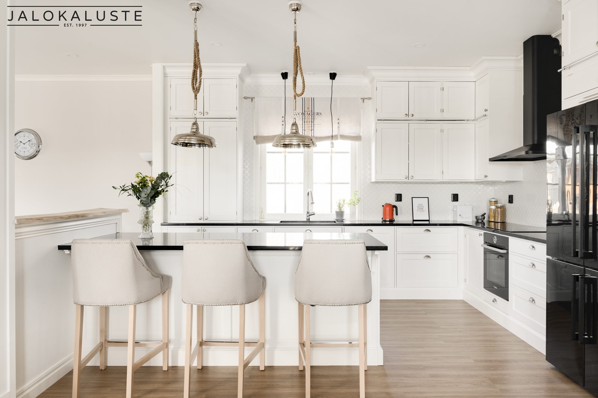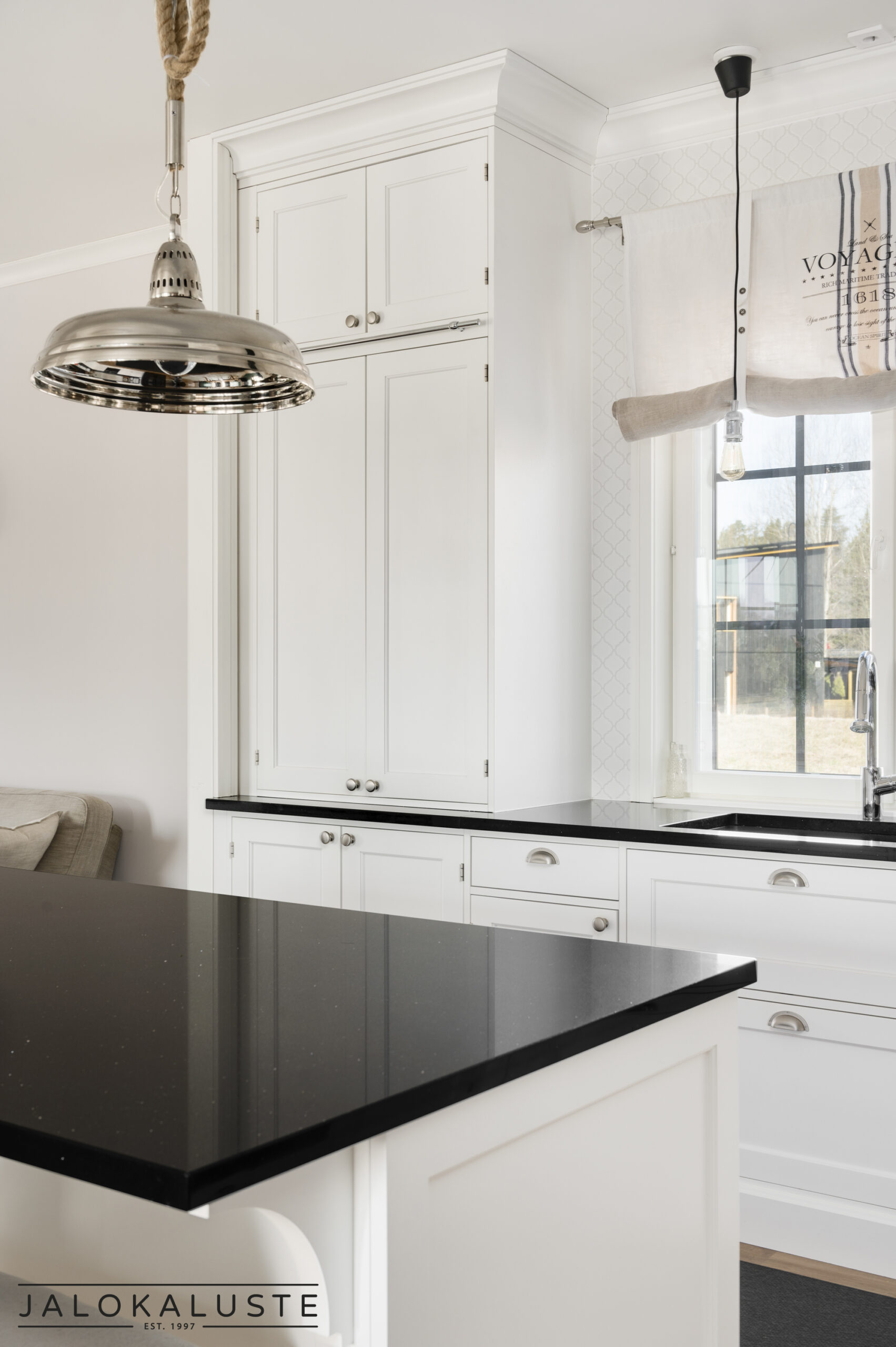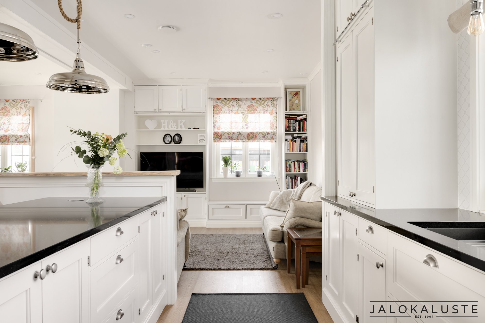 Kökets skåp är gjorda av massivträskiva och dörren är Jalokalustes gamla stils spegeldörr i helträ. Allting har målats i en fräsch vit färgnyans. Arbetsbänkens material är svart kvarts som är ett mycket hållbart och tidlöst material. Köket är en del av vardagsrummet och tv-rummet. Då kökets färgskala är neutral så passar köket ihop med vardagsrummets all inredning och alla tänkbara färger.