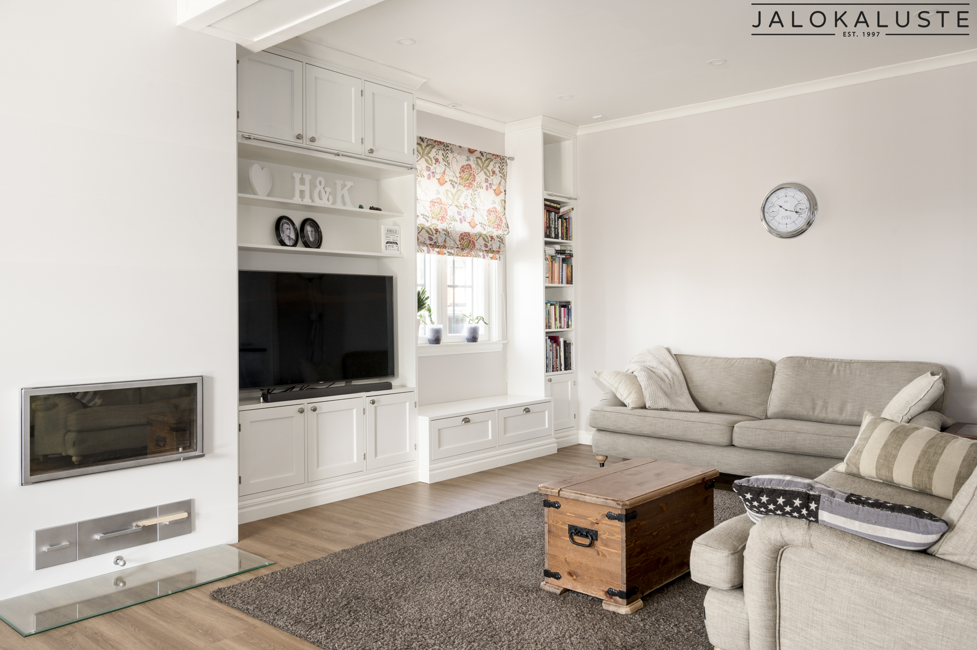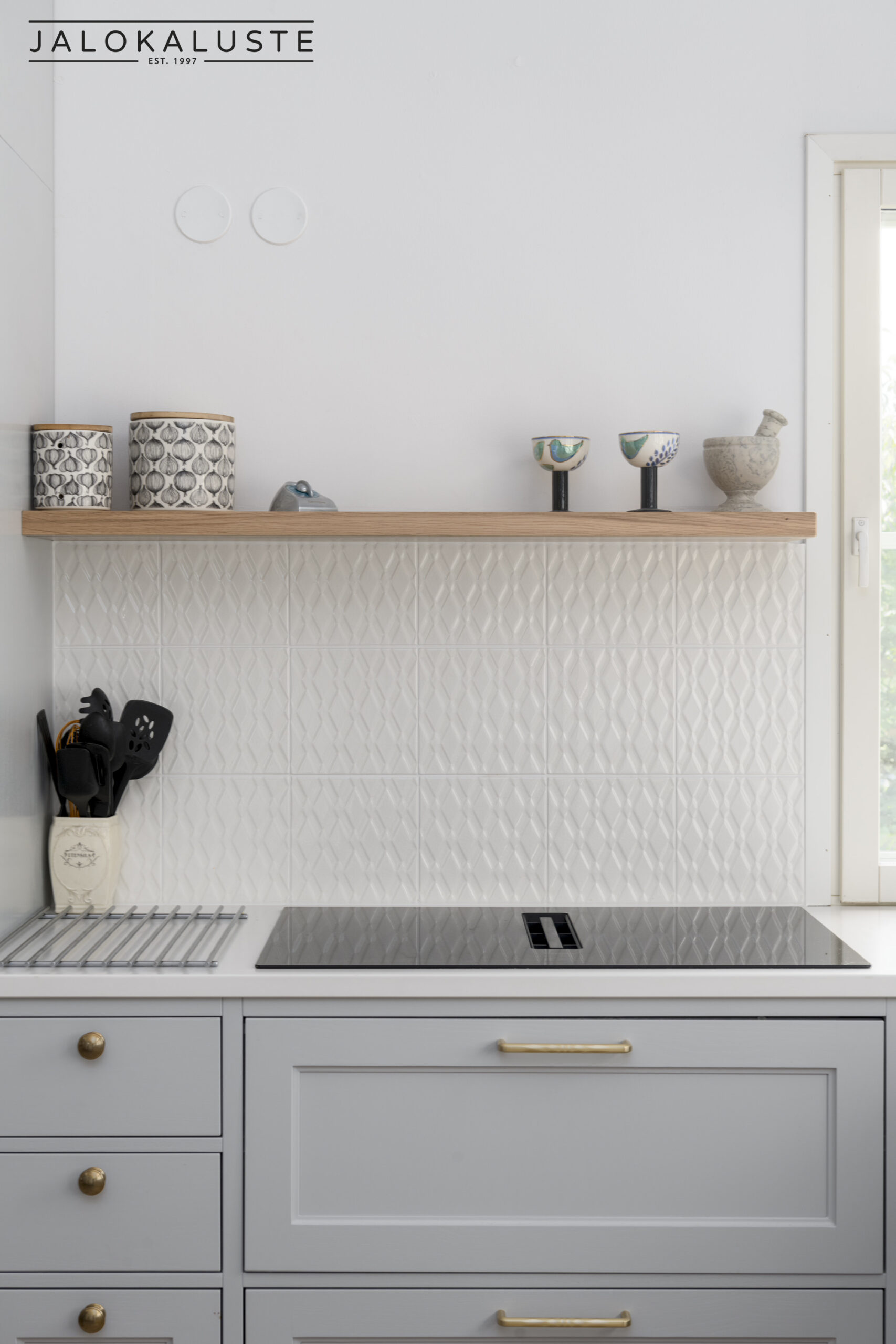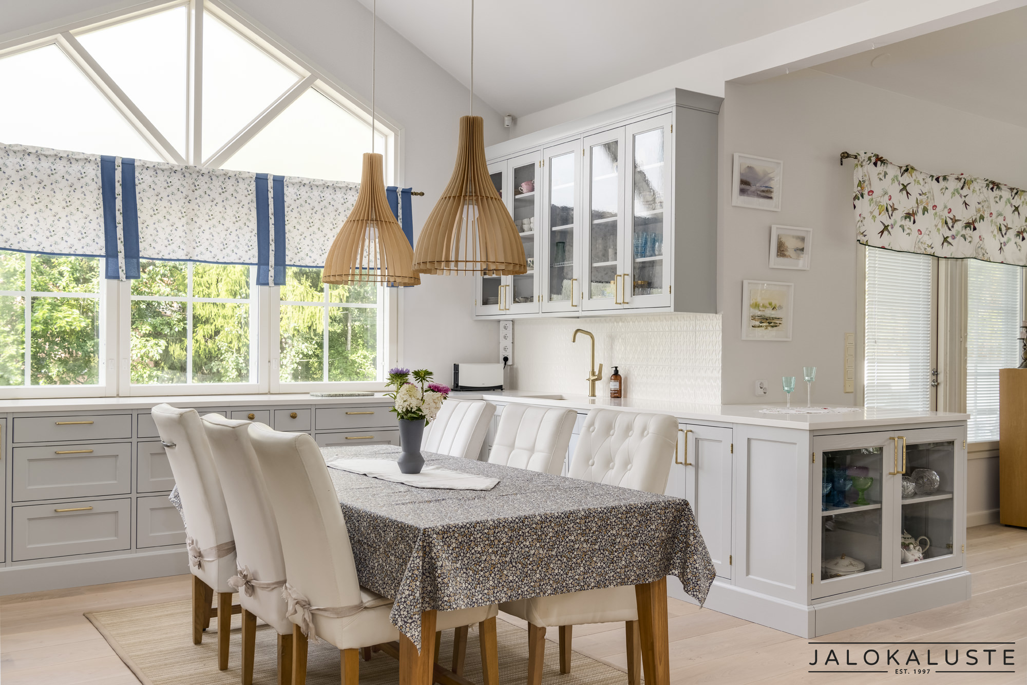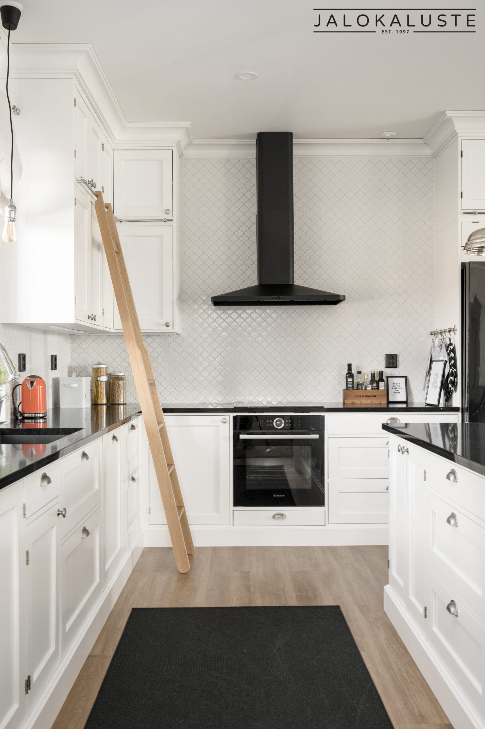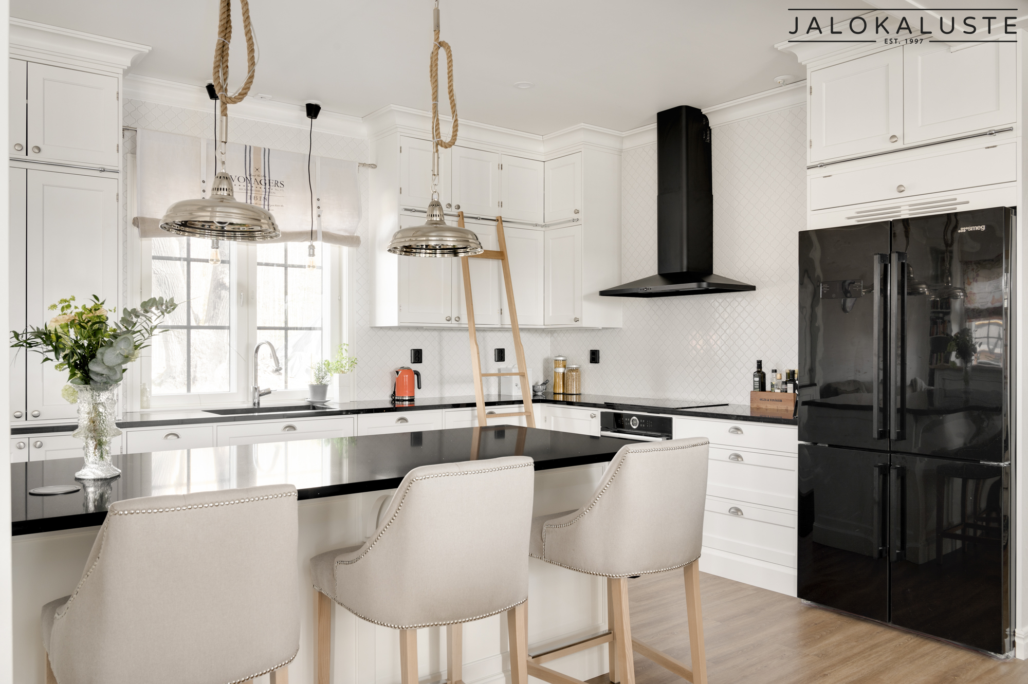Kökets skåp är gjorda av massivträskiva och dörren är Jalokalustes gamla stils spegeldörr i helträ. Allting har målats i en fräsch vit färgnyans. Arbetsbänkens material är svart kvarts som är ett mycket hållbart och tidlöst material. Köket är en del av vardagsrummet och tv-rummet. Då kökets färgskala är neutral så passar köket ihop med vardagsrummets all inredning och alla tänkbara färger.