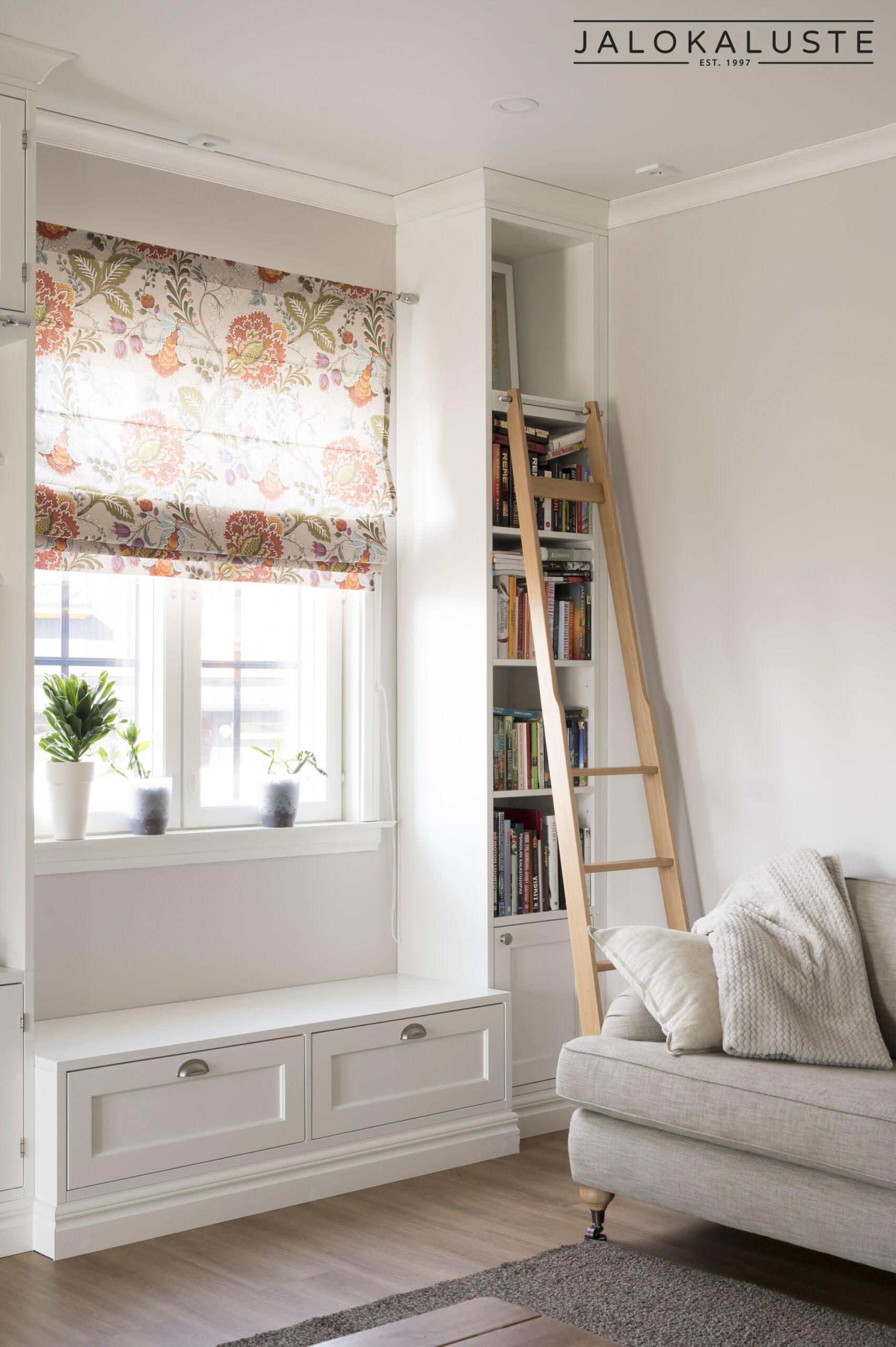 I det fräscha Katarina gamla stils köket har rumshöjden utnyttjats optimalt. Övre skåpen har ritats att gå ända upp till takhöjd. En specialitet i köket är den vackra stegen i massiv ek, med vilken man räcks upp ända till de översta övre skåpen. Samma stege används också till det brevidliggande vardagsrummets bokhylla. Stegen är förutom praktisk också vacker att se på, så kunden tyckte att de inte hade behov av en speciell väggställning för stegen. Stegen fungerar ju samtidigt som ett inredningselement så man vill gärna ha den framme.