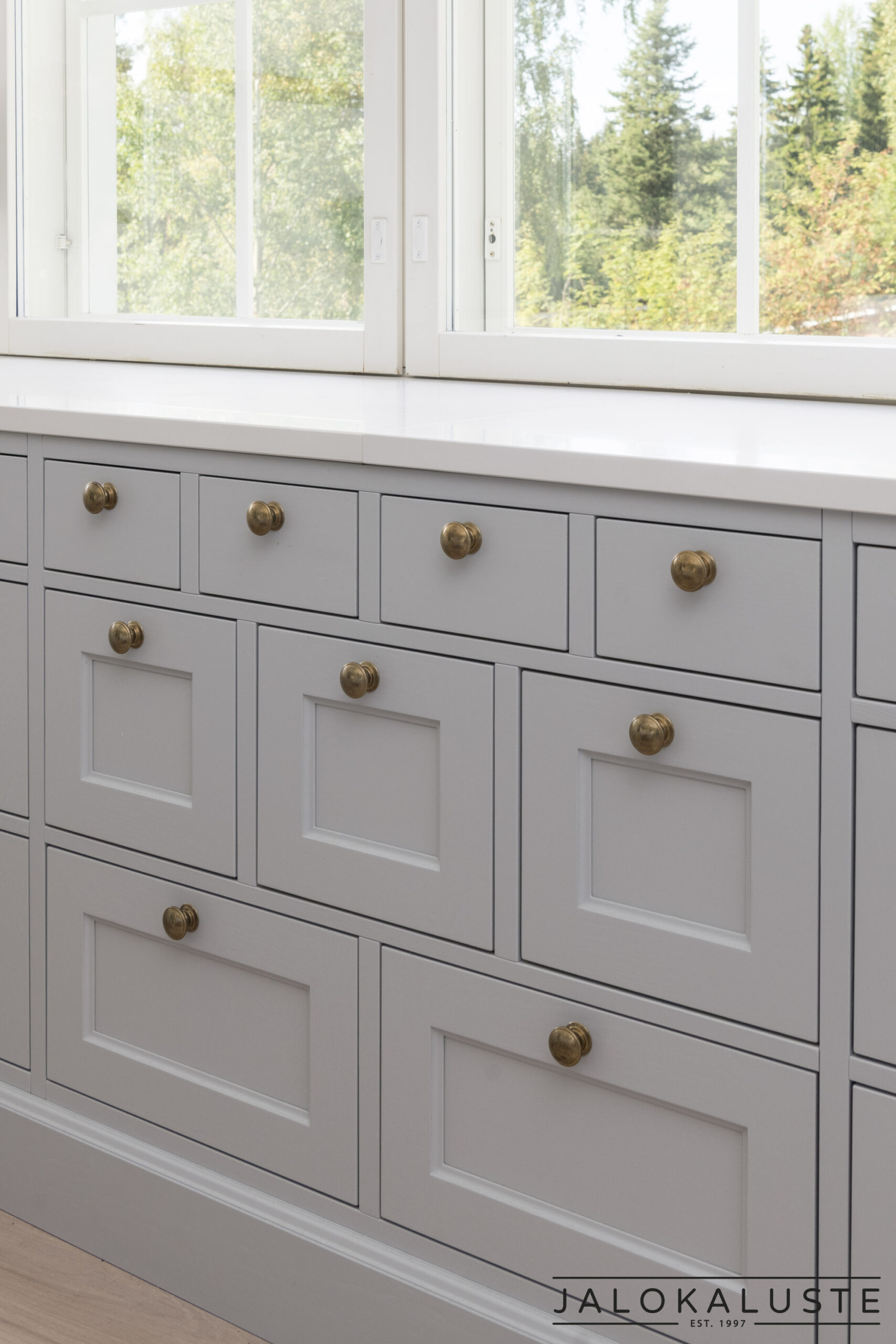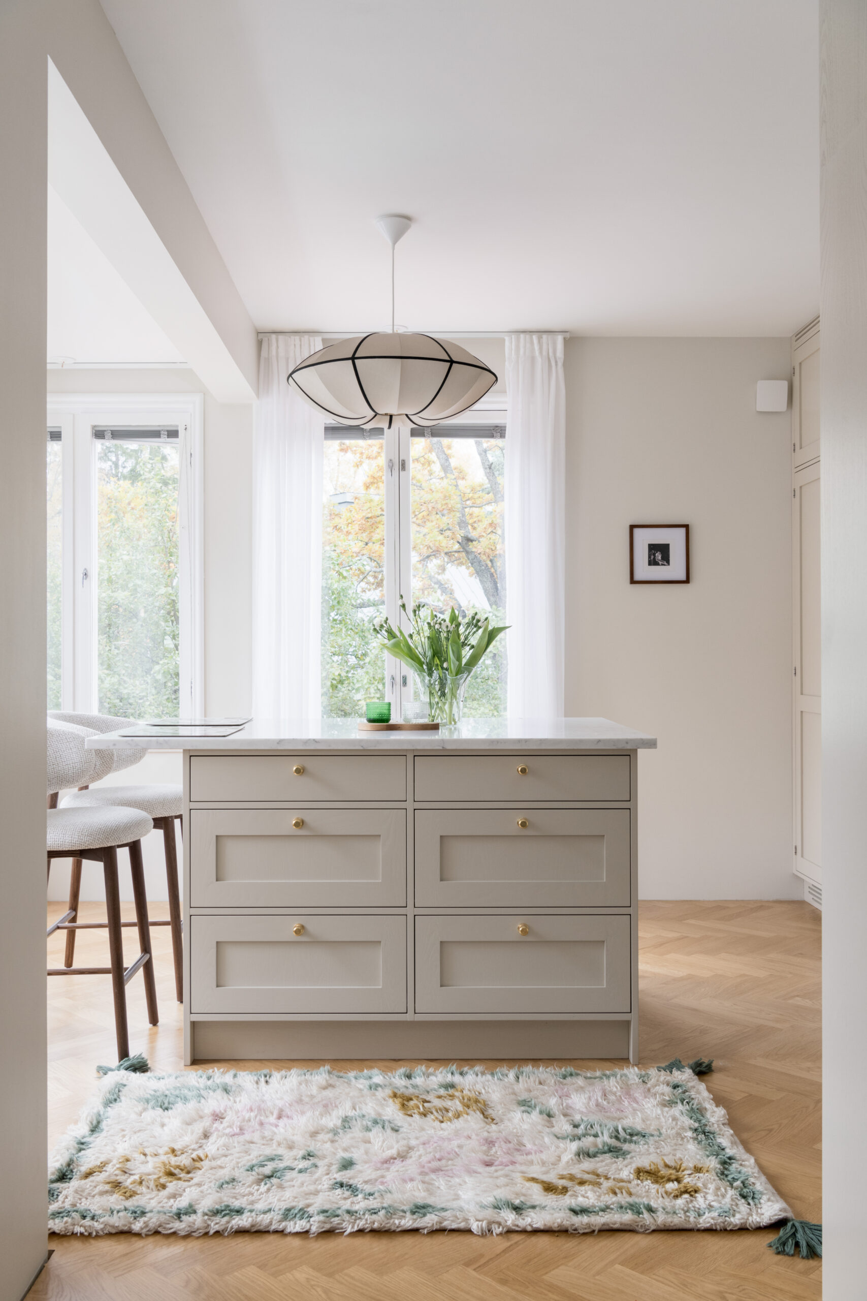 På fönsterväggen hittar man också ett pyramidskåp med många små lådor i olika storlek. Arbetsbänkarna är i en ljus kvarts. De fina knopparna och handtagen i mässing är pricken över iet.