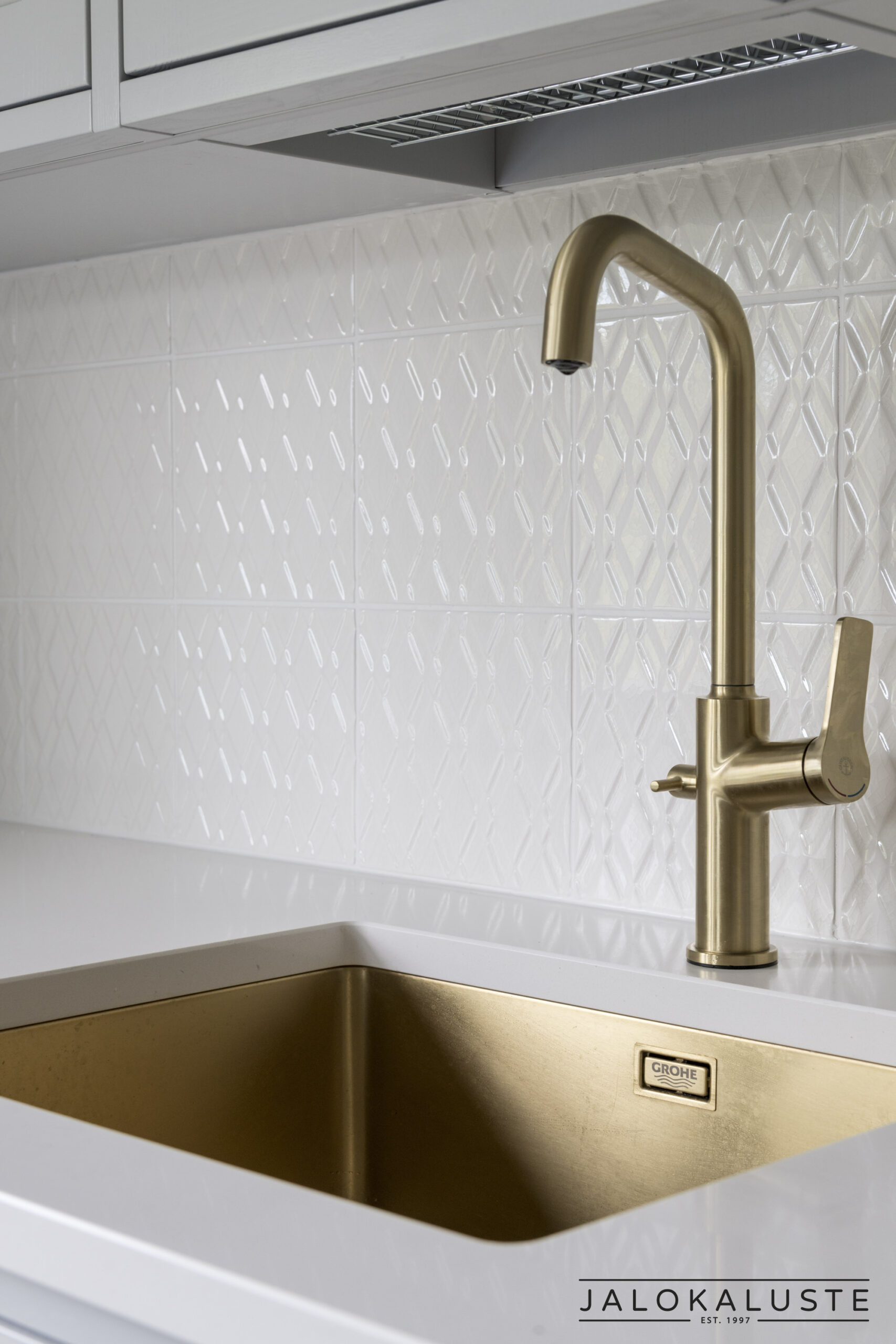 Arbetsbänkarna är av tålig och lättskött kvarts. Den vackra blandaren och diskhon i mässing passar vackert ihop med kökets mässingshandtag.