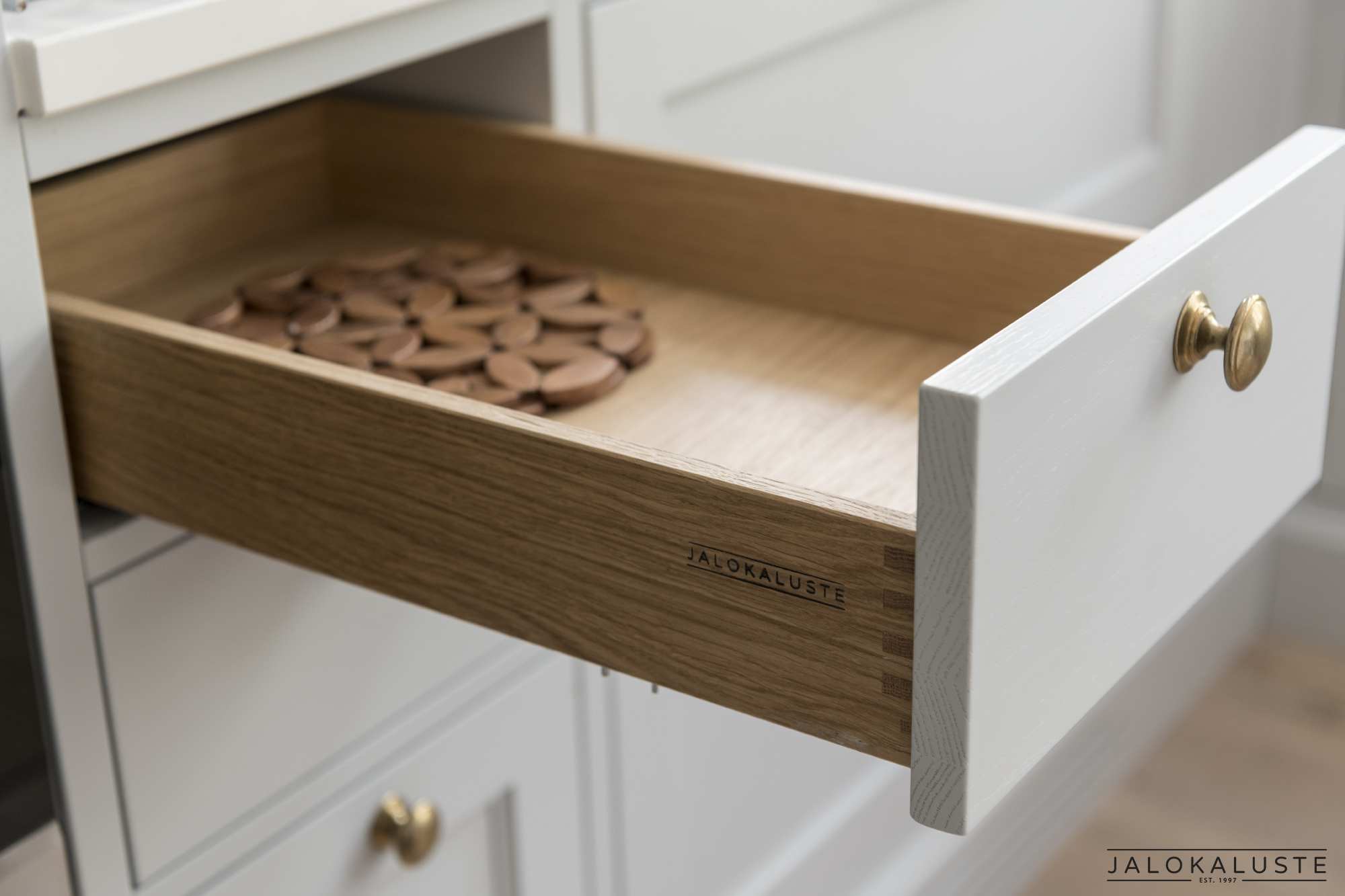 Hörnet har utnyttjats med hjälp av en praktiskt le manse hörnmekanism. Det lilla apotekarskåpet rymmer i sin tur en mängd olje- och kryddbukar. Dessutom finns det också ett högt apotekarskåp dit all torrmat ryms plus lite extra. Lådorna i massiv ek ger ytterligare vardagslyx.