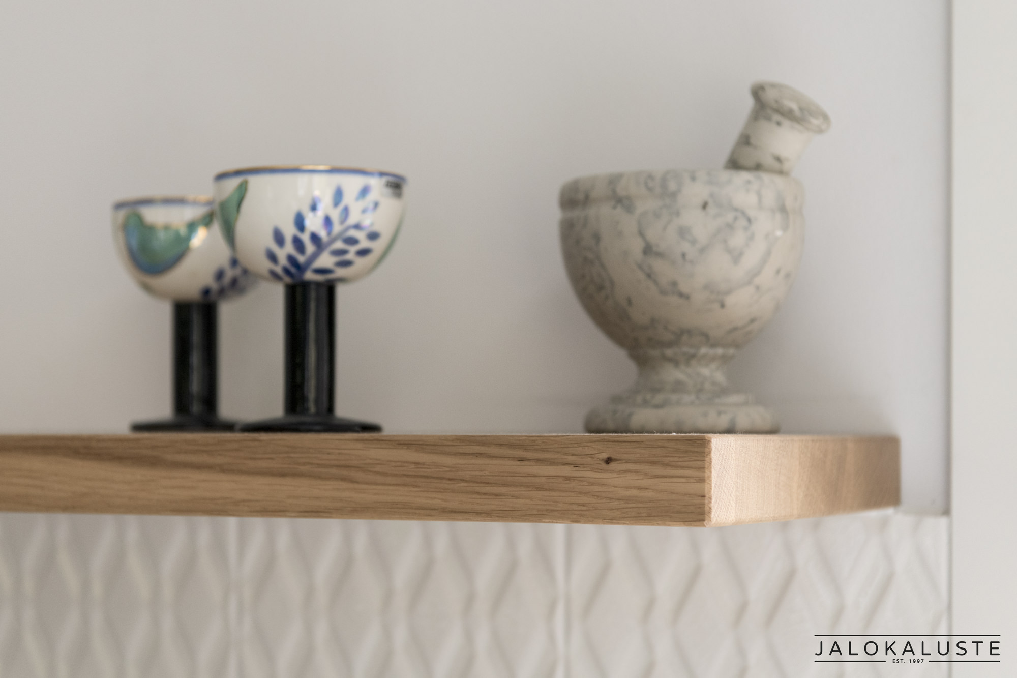 Man hittar också ekträ i köket t.ex. i de öppna hyllorna ovanför spisen. Hyllorna har en osynlig fastsättning så att de ser ut som om de nästan svävar i luften. Man ville inte ge plats för en väggfläkt i det här köket, utan man har valt en praktisk induktionsfläkt som gör att det blir luftigt ovanför spisplattan.