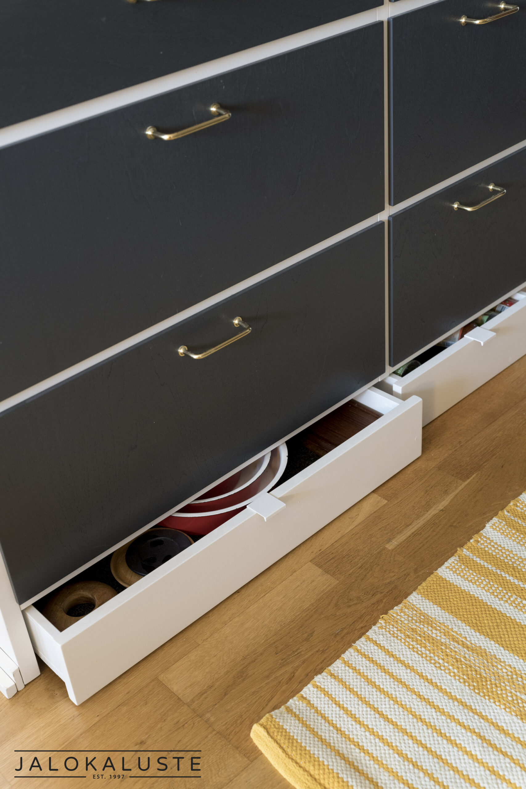 Suomi 100-köket visades på HABITARE 2017-mässan i Helsingfors. Köket målades i Finlands färger jubileumsåret till ära. Här kan man se många av våra olika lösningar för metallådorna, så som delare i metall, en ställning för plastfolie, en ställning för knivar, inre lådor bakom en dörr osv.